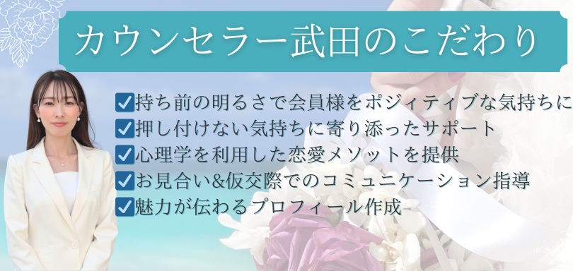 当相談所のカウンセラー武田は、会員様一人ひとりに寄り添った婚活サポートを心がけています。心理学の専門知識を活かし、