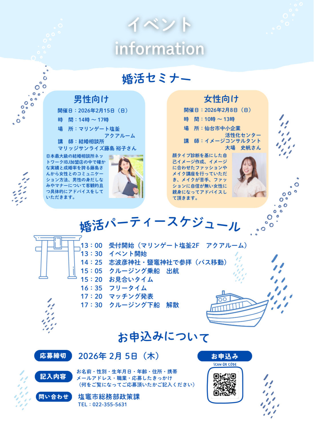 宮城県塩竈市にて、塩竈市婚活支援事業として婚活イベント「塩むすび」を開催いたします。